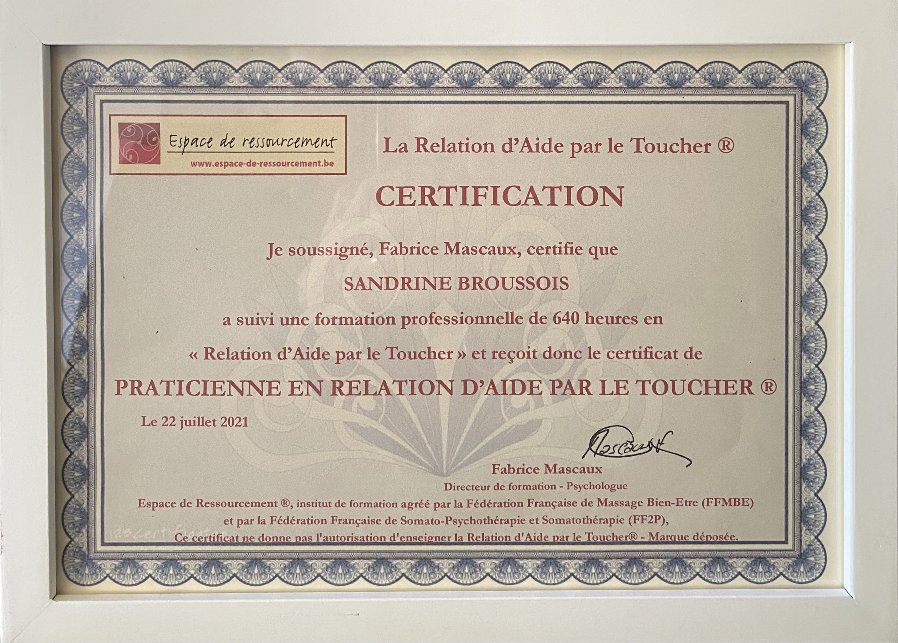 IMG_4254Praticienne en Relation d’Aide par le Toucher – Méthode Jean Louis Abrassart (640 h)